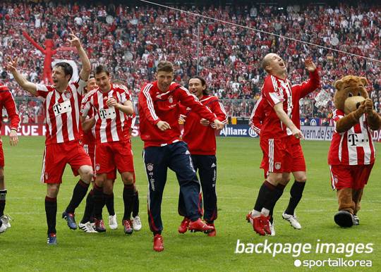 [스포탈코리아] 5월 2일(한국시간)에 독일 뮌헨의 알리안츠 아레나에서 열린 2009/2010 분데스리가 33라운드 바이에른 뮌헨과 VFL 보쿰의 경기. VFL 보쿰을 3-1로 꺾고 사실상의 리그 우승을 확정지은 바이에른 뮌헨의 선수단이 홈팬들과 함께 응원가에 맞추어 즐겁게 춤을 추고 있다. ⓒFiroSportPhoto/BPI/스포탈코리아