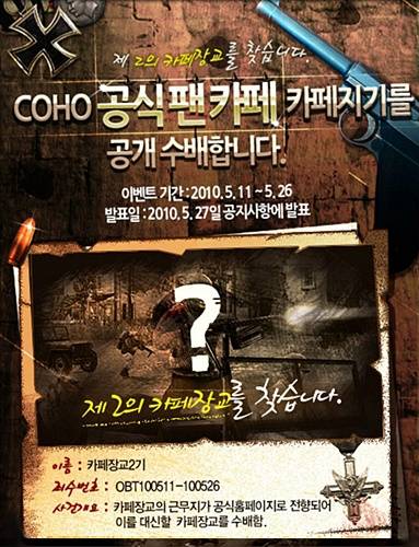 카페장교를 원하는 유저는 공식 팬 카페에 자신의 소개 글과 'COHO' 관련 블로그 및 카페 URL, 윈디존 아이디 또는 닉네임을 기재하는 방식으로 신청하며, 접수는 오는 26일까지 진행되고 오는 27일 2대 카페장교의 임명이 있을 예정이다.