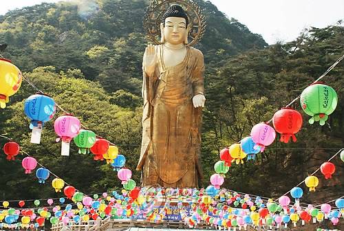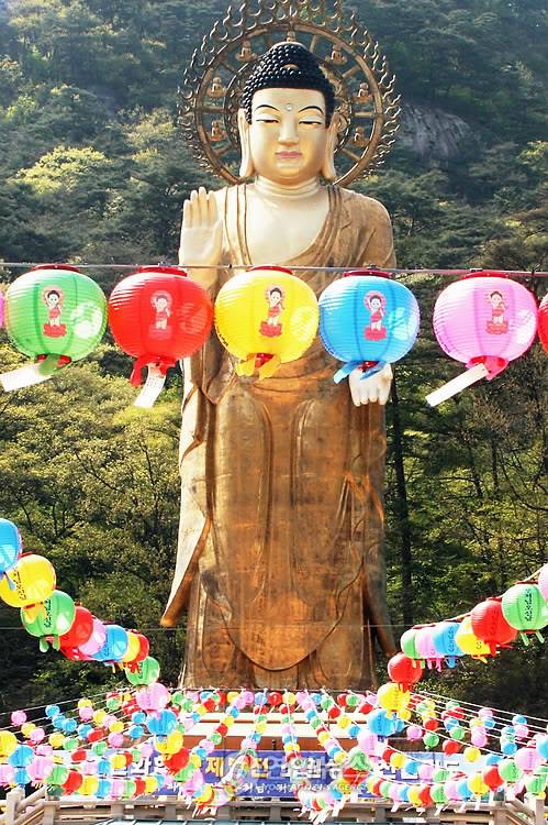 (보은=연합뉴스) 불기 2554년 부처님 오신 날(21일)을 앞두고 충북 보은 속리산 법주사 금동미륵대불 앞에 오색 연등이 내걸렸다.