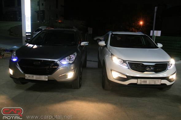 그리고 프로젝션 헤드램프입니다. 좌측이 스포티지R, 우측이 투싼입니다. 밝기의 차이가 아주 명확하게 보이시지요? 프로젝션 램프가 들어간 수출형 투싼의 부품을 기를 쓰고 구하는 오너들의 마음이 이해가 되는 부분입니다. 저도 부품을 구할 수만 있으면 당장 바꾸고 싶습니다.