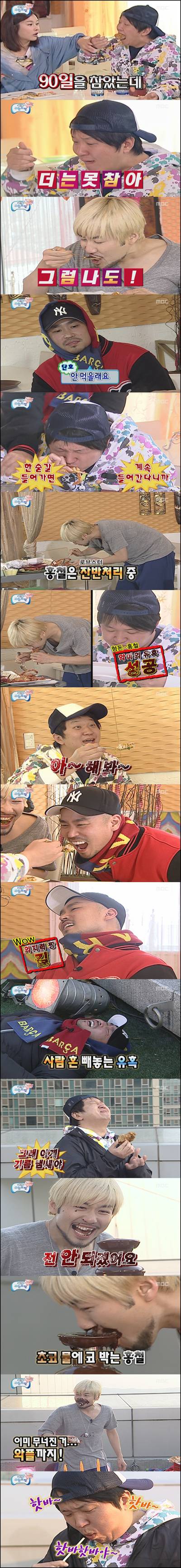 마침내 노홍철은 "기왕 이렇게 된 거 어떻게 하겠나. 전 못참겠어요"라며 그를 위해 준비된 초콜릿 분수에 얼굴을 파묻고 말았다. 그는 초콜릿 범벅이 된 채 와플을 먹었다. 노홍철은 환희의 춤사위를 선보였다. 정형돈과 길은 끝까지 유혹을 참아 냈다.