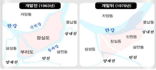 잠실은 원래 경기도 고양군 뚝도면에 속한 자마장(뚝섬)리와 연속된 반도 형태였다. 이후 홍수로 인해 작은 지류(새내강)가 생겨 독립된 하중도인 잠실섬이 됐고, 잠실섬과 뚝섬과 연결하는 잠실나루가 있었다.