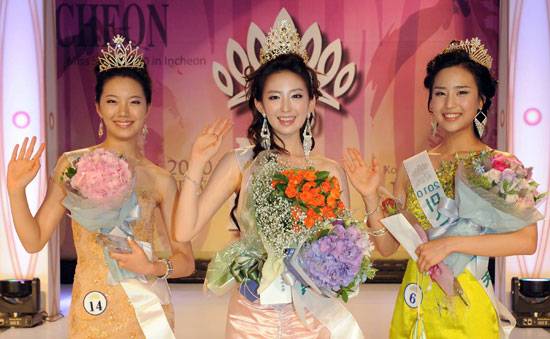 인천 라마다송도호텔에서 8일 열린 '2010 미스인천 선발대회'에서 온인주(24ㆍ가운데)양이 미스인천 진에 선발돼 포즈를 취하고 있다. 이나현(18ㆍ왼쪽)양이 선에, 한채량(18)양이 미에 선발됐다. /인천=박서강기자