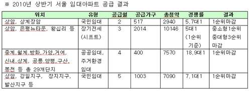 부동산정보업체 부동산써브가 올 상반기 서울에서 공급된 임대아파트(장기전세 및 국민임대)의 청약경쟁률 등을 조사한 결과 국민임대가 모두 1순위 마감, 장기전세 시프트는 중소형 1순위, 중대형 3순위 마감된 것으로 나타났다.