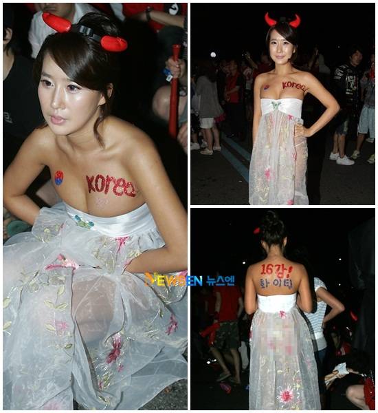 그러나 누구보다도 가장 눈에 띈 사람은 이른바 '똥습녀'라는 별명을 갖고 있는 임지영씨. 그녀는 이날 영동대로 응원전에 속이 훤히 비치는 흰색 개량한복을 입고 등장했다.