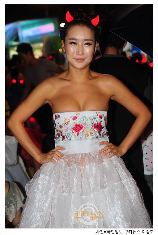 [쿠키 스포츠] 지난 독일월드컵 당시 엉덩이가 훤히 비치는 비닐옷을 입어'똥습녀'라는 애칭을 얻은 임지영씨가 26일 오후 서울 삼성동 코엑스 앞에서 열린 대한민국과 우루과이의'2010 남아공 월드컵'16강전 거리응원에 참석해 취재진을 향해 포즈를 취하고 있다.