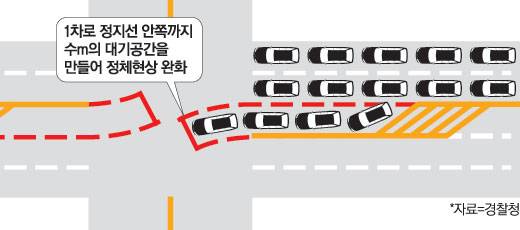현재 모든 차량은 교차로 정지선 밖에서 대기하다가 신호가 떨어지면 이동하게 돼 있다. 이 과정에서 좌회전 차량 수요가 많은 교차로의 경우 교차로 진입 전 10~20m에 달하는 '좌회전 포켓차로'가 직진 차량과 뒤엉키는 병목현상이 발생했다. 특히 올해 교통신호체계가 기존 '좌회전 후 직진'에서 '직진 후 좌회전'으로 바뀌면서 서울 교대역 교차로 등 일부 구간은 정체가 더욱 심해졌다. 이에 따라 경찰청은 1차로 정지선 안쪽까지 수m의 좌회전 전용 별도 대기공간을 만들어 좌회전 차량 소통량을 높일 계획이다.