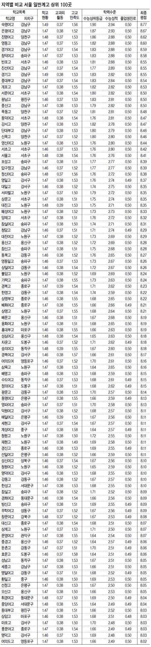 숙명여고에 이어 ▷은광여고(강남구ㆍ8.67점) ▷진명여고(양천구ㆍ8.62점) ▷영동고(강남구ㆍ8.60점) ▷경기여고(강남구ㆍ8.59점) ▷창덕여고(송파구ㆍ8.58점) ▷반포고(서초구ㆍ8.55점) ▷진선여고(강남구ㆍ8.55점) ▷경기고(강남구ㆍ8.55점) ▷중대부고(강남구ㆍ8.54점) 등이 뒤를 이었다. 상위 10개 고교 중 진명여고를 제외한 나머지 고교가 이른바 '강남 3구(서초 강남 송파)'에 소재한 학교였다. '강남 불패'가 여실히 확인된 셈이다.