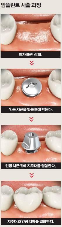 물론 잇몸질환 치료로 모든 치아를 보존할 수 있는 것은 아니다. 자연 치아를 되살릴 수 없을 정도라면 뽑아내고 인공 치아로 교체해야 한다. 임플란트 인공 치아가 대표적이다. 몇 년 전만 해도 틀니나 브리지라는 보철물이 일반적이었지만 단점이 많았다. 다른 보철물의 단점을 보완한 임플란트는 자연 치아에 버금갈 정도로 환자에게서 만족도가 높다. 보험 혜택이 적용되지 않아 치료비가 비싼 것이 단점이다.