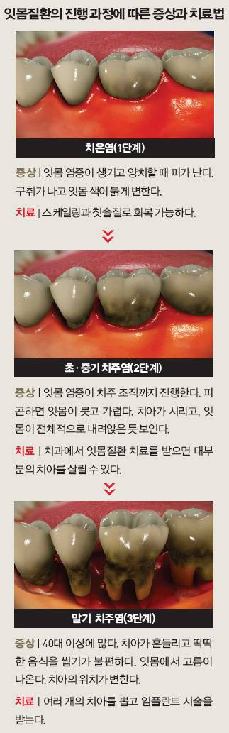 가장 흔한 잇몸질환인 잇몸 염증은 병의 정도에 따라 치은염과 치주염으로 나뉜다. 비교적 가볍고 회복이 빠른 형태의 질환이 치은염이고, 염증이 잇몸과 잇몸 뼈 주변까지 진행된 경우가 치주염(풍치)이다. 잇몸이 붓고 피가 나며 냄새도 난다. 심해지면 치아가 흔들리고 통증이 생기며 고름이 나기도 한다. 잇몸 염증은 세균에 의해 염증이 생기는 병이다. 세균이 번식하기 좋은 환경이 치태(플라그)이다. 제거하지 않으면 단단해지면서 치석이 된다. 이쯤 되면 잇몸과 치아 사이에 치주낭이 형성된다. 이 주머니 속에 치석과 함께 세균이 번식하면서 염증이 생긴다. 염증은 잇몸과 치아 사이를 벌어지게 해 치조골과 치주인대도 파괴한다. 이때 치아가 흔들리는 느낌을 받는다.