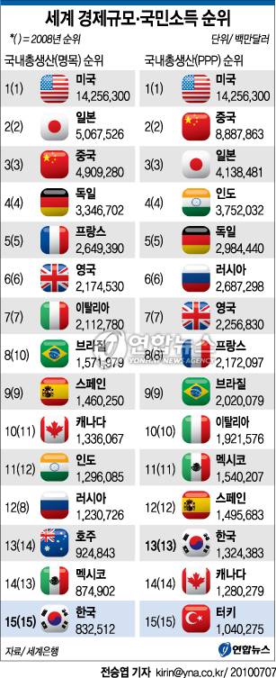 (서울=연합뉴스) 조재영 홍정규 기자 = 우리나라의 국민소득 세계 순위가 뒷걸음친 것으로 7일 세계은행의 `세계개발지표(WDI)'에서 확인됐다.