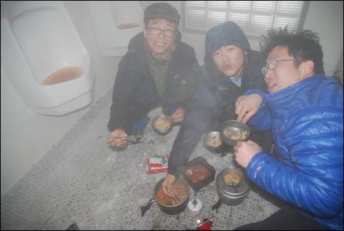 지난 겨울 월간 < 작은책 > 안건모 대표가 역사 기행을 갔다가 화장실서 밥먹는 사진을 찍어왔다. 남자 소변기에 누렇게 오줌이 얼어있는 화장실 바닥에 신문지를 깔아 놓고 라면을 끓여 찬밥과 먹는 장면이었다.