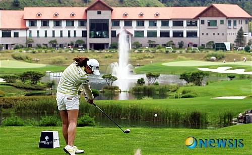 【진천=뉴시스】서재훈 기자 = 30일 충북 진천 히든밸리 골프장에서 '1회 히든밸리 여자오픈'이 열린 가운데 조영란이 9번홀에서 클럽하우스를 배경으로 티샷을 시도하고 있다. (사진=KLPGA 제공)