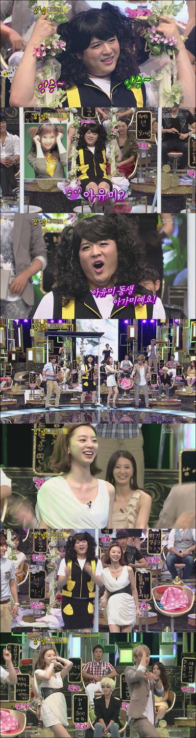 여장을 하고 등장한 신동은 "아유미 동생 아가미다"며 "요즘 관리를 못해 살이 쪘다. 바빴다"고 너스레를 떨었다.