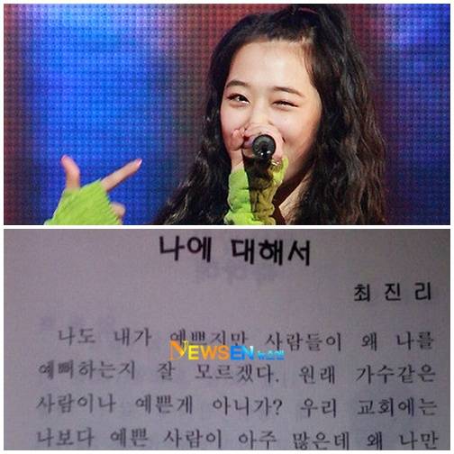 설리는 초등학생 시절 "나도 내가 예쁘지만 사람들이 왜 나를 예뻐하는지 잘 모르겠다. 원래 가수 같은 사람이나 예쁜 게 아닌가? 나보다 예쁜 사람이 아주 많은데 왜 나만 귀여워하고 예뻐할까? 난 사람들의 그런 점이 정말 싫다"고 자신의 생각을 솔직하게 밝힌 글을 작성한 바 있다.