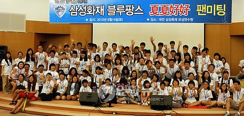 (서울=연합뉴스) 지난 14일 삼성화재 유성연수원에서 열린 대전삼성화재블루팡스 2010 팬미팅에서 참석자들이 기념촬영을 하고 있다. 2010.8.16 < < 삼성화재 > >