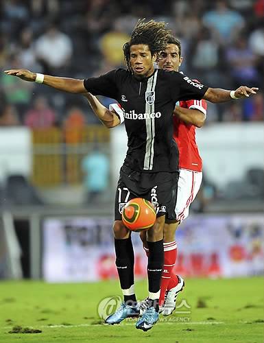 epa02291898 (FILE) A file picture dated 18 July 2010 shows Benfica's Ruben Amorim (back) struggling for the ball with Vitoria Guimaraes' Bebe (front) during the City of Guimaraes Trophy soccer match at D. Afonso Henriques Stadium in Guimaraes, Portugal. Manchester United announced on 18 August 2010 that they have signed 20-year-old Portuguese player Tiago Manuel Dias Correia, known as 'Bebe', who became United's third recruit of the offseason last week when he joined the Premier League side from Portuguese club Vitoria Guimaraes for 7 million pounds (8.5 million euro; 11 million US dollars). Bebe was homeless as a child, until he was taken in by an orphanage at the age of 10, reports said. After proving his soccer skills on the street, Bebe went on to represent his country in the Homeless World Cup, an international competition played by homeless athletes. EPA/HUGO DELGADO < 뉴스의 새 시대, 연합뉴스 Live >< 모바일 애플리케이션 >< 포토 매거진 >< 저작권자(c)연합뉴스. 무단전재-재배포금지. >