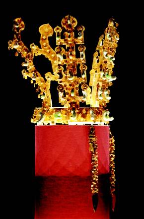 천마총 금관은 둥근 관테에 3개의 나뭇가지 모양과 2개의 사슴뿔 모양 세움장식을 맞붙이고, 58개의 곱은 옥과 328개의 달개(장식물의 일종)를 달아 장식한 것이 특징이다. 나뭇가지와 사슴뿔은 하늘과 땅을 이어주는 매개체, 곱은 옥은 원초적 생명체, 달개는 생명의 열매를 뜻하는 것으로 추정되는데, 제사장이기도 했던 신라 왕의 권위를 드러내는 상징물로 풀이되고 있다. 이번 전시에는 다채로운 꾸미개 장식이 달린 천마총 출토 허리띠도 함께 전시된다. (02)2077-9000.
