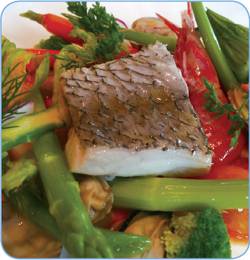 살집이 두툼하고 식감이 뛰어난 민어는 여름 계절 메뉴의 선두주자로 속이 촉촉하면서도 겉은 바삭하게 구워 특제 소스와 제철 채소, 해산물과 같이 접시에 예쁘게 올린다. 접시가 한폭의 그림이 되는 부티크 블루밍에서의 식사는 시각도 즐겁게 해주는 특별한 시간이 된다. 야채 샐러드와 민어구이를 곁들인 해산물 스튜는 브로콜리, 어린 당근, 샐러리 줄기 등의 야채는 데치고 바지락, 홍합, 새우, 민어의 해산물은 깔라마타 올리브 오일에 살짝 둘러 특제소스와 함께 마무리 했다.