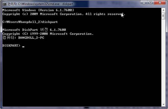 ② diskpart라고 입력하고 Enter를 누르면 diskpart 명령어 입력 상태로 전환된다.