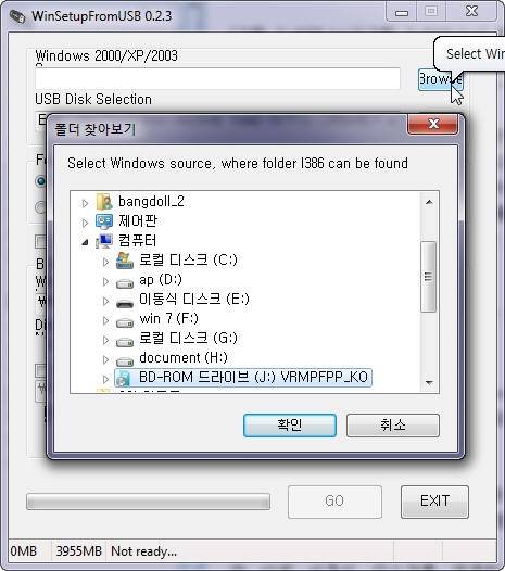 ② 프로그램 창이 뜨면 맨 위의 [Browse] 버튼을 누른 다음 윈도XP 설치 CD가 있는 광학 드라이브를 고른다. ISO 파일로 가지고 있다면 가상 CD 프로그램을 이용한다.