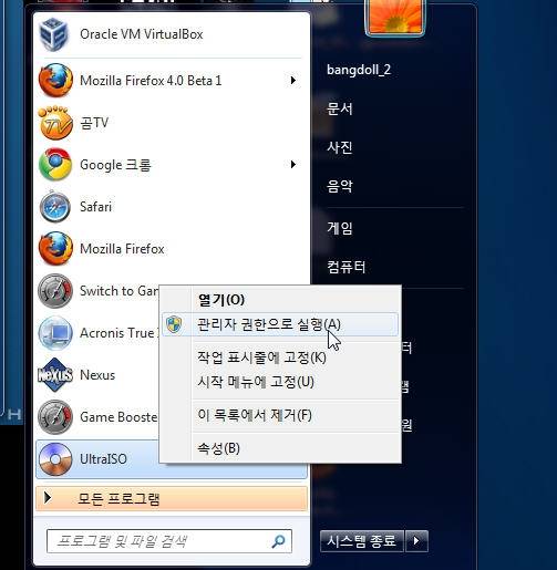 이동식 디스크에 운영체제 담기UltraISO를 이용해 윈도7과 XP를 하나로 합쳐서 이동식 디스크에 넣어야 한다.UltraISO를 오른쪽 클릭해 [관리자 권한으로 실행]을 누른다.