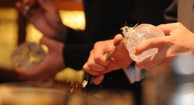 서울 청담동의 바 커피바K. 문 여는 오후 7시보다 조금 일찍 이 곳에 들어서면 바텐더들이 얼음조각을 튀겨가며 둥글게 얼음을 깎는 이색적인 광경이 펼쳐진다. 얼음공장에서 납품받은 단단한 육면체 얼음덩어리는 바텐더들의 능숙한 손에서 2~3분만에 지름 12㎝ 안팎의 동그란 아이스 볼이 된다. 이 아이스 볼은 온 더 락스 잔을 꽉 채워 위스키와 함께 서빙된다.