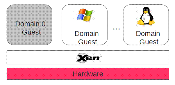 캠브리지 대학의 연구 프로젝트로 시작한 Xen은 IA-32, x86-64, Itanium and PowerPC 970 계열 아키텍쳐의 VMM이다. 게스트 OS의 커널 내부를 수정하여 하이퍼바이저와 통신하도록 하고, HW의 제어는 이 하이퍼바이저를 통해서 이루어지는, 이른바 반가상화 기술이다. 현재 Xen은 Linux, BSD, Opensolaris 등 오픈 소스 계열은 Host 및 Guest OS 모두 지원하지만 MS Windows 계열 OS는 Guest OS로만 가능하며 이 또한 하드웨어 사양이 Intel-VT 나 AMD-V CPU 인 경우에 한한다