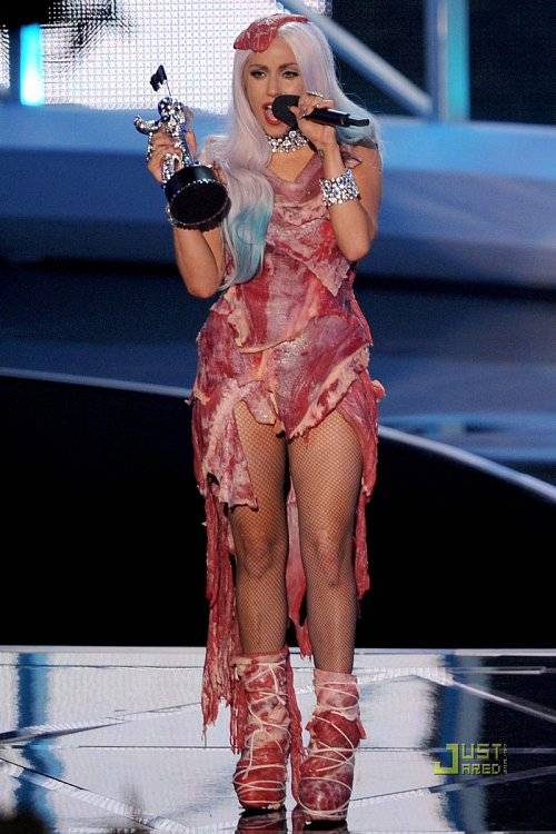 지난 12일(현지시간) 미국 로스앤젤레스 노키아 극장 L.A. 라이브에서 열린 2010 MTV 비디오 뮤직 어워드에 가수 레이디 가가 고기로 만든 드레스를 입고 나타난 모습이 미국 연예정보 사이트 저스트자레드(www.justjared.buzznet.or.kr)를 통해 공개됐다. 가수이자 행위예술가인 레이디 가가는 고기로 만든 의상을 입은 것은 물론 클러치 백까지 들고 있었다.