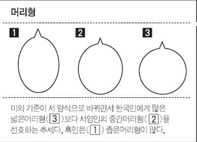 한국인의 머리는 이마부터 뒤통수에 이르는 길이가 서양인보다 짧고 귓구멍부터 정수리까지 높이는 높다. 이처럼 머리 부위별 길이나 너비 등의 평균치수를 토대로 보면 인류의 머리 모양은 크게 세 가지로 나뉜다. 이마부터 뒤통수까지 길이가 가장 긴 좁은머리형은 흑인에서, 가장 짧은 넓은머리형은 한국인을 비롯한 동양인에서 많다. 서양인은 둘 사이인 중간머리형이다. 이 같은 차이는 뼈나 근육의 형태를 결정짓는 유전자의 비율이나 발현 양상 등이 인종마다 다르기 때문인 것으로 학계에선 추측하고 있다. 하지만 한국인이나 서양인 머리 모양을 좌우하는 결정적인 유전자가 존재하는지는 밝혀지지 않았다.