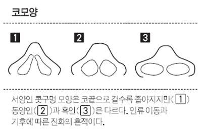 고 교수는 "인류가 몽고와 시베리아를 거쳐 이동하는 과정에서 추위를 견디기 위해 눈을 작게 뜨면서 생겨난 신체적 특징"이라며 "콧구멍 모양에서도 이와 비슷한 진화의 흔적을 확인할 수 있다"고 말했다. 서양인 콧구멍은 코끝으로 갈수록 좁아지지만 흑인은 반대다. 상대적으로 추운 지방에 적응해야 했던 서양인의 코는 허파로 들어가는 공기를 빨리 덥히기 위해 통로를 좁혔다는 설명이다.