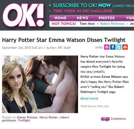 '해리포터'시리즈 여주인공 헤르미온느 역의 엠마 왓슨은 최근 영국 OK 매거진과 인터뷰에서 "'트와일라잇'은 섹스를 팔고 있다"고 주장했다.