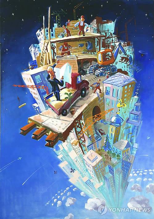 (대구=연합뉴스) 다음 달 1일부터 대구 갤러리M에서 국내 첫 개인전을 여는 독일의 화가 피터 앙거만의 작품 '바벨탑(Turmbau zu Babel)'. 성경에 나오는 하늘에 닿는 바벨탑처럼 현대 건축물이 지구 밖으로 뻗어 있다. 2010.9.30