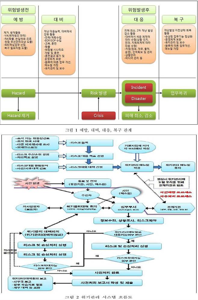 우리는 종종 예방, 대비, 대응 그리고 복구 용어를 혼동하여 사용하고 있는데, 이들 용어들은 위험 발생 전(예방, 대비)과 사건, 재난 발생 후(대응, 복구)로 구분되어 정의될 수 있으며 예방, 대비, 대응, 복구의 관계를 그림 1에 나타내었다. 예방은 위험요소를 사전에 제거하거나 발생할 수도 있는 위험을 사전에 방지하는 활동으로서 위험분석 활동과 업무영향 분석 활동이 이에 해당된다. 대비는 재난에 대응할 수 있는 능력 향상 활동과 대비태세를 강화하기 위한 활동으로서 전략수립, 계획수립, EOP수립, SOP수립, 교육, 훈련, 환류, 위험별 시나리오 개발 및 훈련, 훈련결과 평가 및 운영체계보완, 환류에 따른 업무개선과 매뉴얼 개정 그리고 유지관리 및 보수 등이 이에 해당된다.