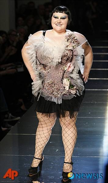 【파리(프랑스)=AP/뉴시스】2일(현지시간) 프랑스 파리에서 장 폴 고티에 2011 춘하 기성복 패션쇼가 열린 가운데 패션쇼 말미에 참여한 미국 가수 베스 디토가 포즈를 취하고 있다.