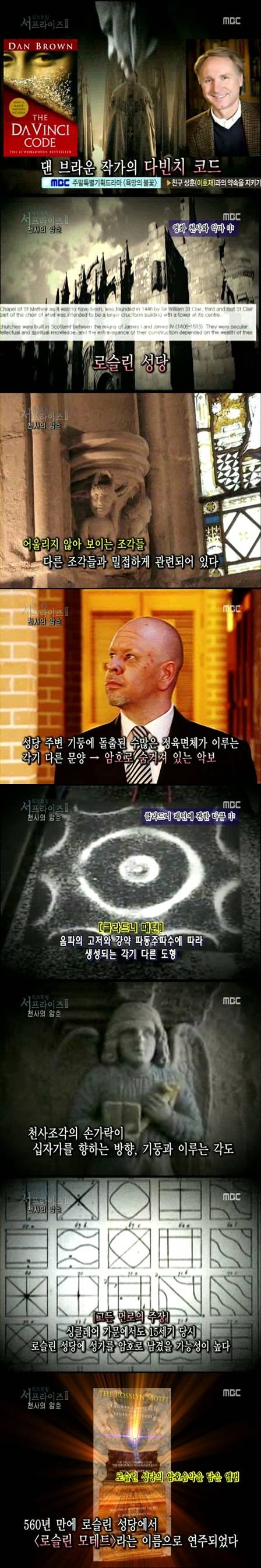 10월3일 방송된 MBC '서프라이즈'에서는 영화 '다빈치 코드'의 배경이 된 로슬린 성당의 비밀을 풀어헤쳤다.