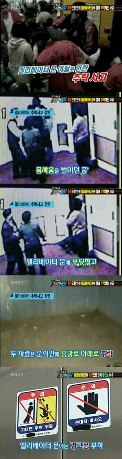 4일 방송된 KBS 2TV '위기탈출 넘버원(이하 위기탈출)'에서는 엘리베이터 문에 충격이 가해져 문이 이탈한 사이 승강로 아래로 추락 할 수 있다고 경고했다.