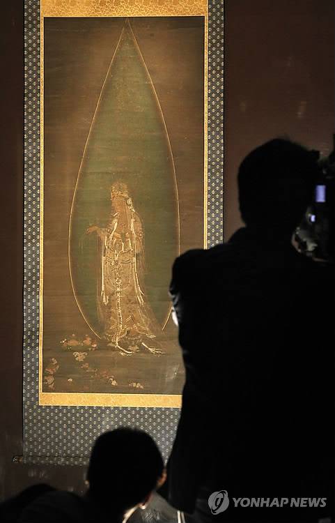 (서울=연합뉴스) 이상학 기자 = 11일 서울 용산구 국립중앙박물관에서 취재진들이 기획특별전 '고려불화대전' 개막을 하루 앞두고 열린 사전행사에서 '수월관음도를 살펴보고 있다. 일반적인 수월관음도가 바위에 걸터앉는 모습인 것과 달리 이 수월관음도는 은은한 녹색의 물방울 모양 광배 안에 서 있는 자세로 표현되어 있어 '물방울 관음'이라는 별칭으로 불리기도 한다. 2010.10.11