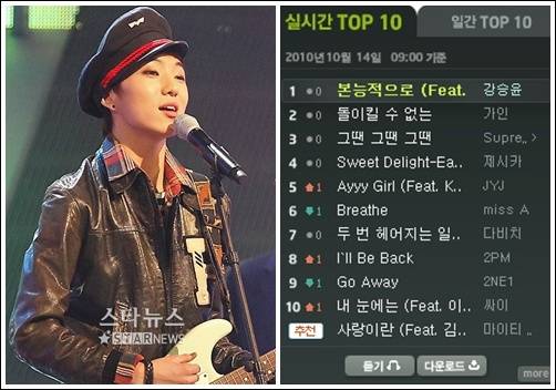 Mnet '슈퍼스타K2'가 낳은 스타 강승윤이 미션곡으로 부른 '본능적으로'로 음원차트 1위에 올랐다.
