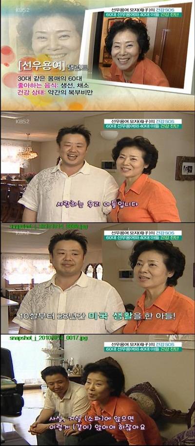 10월 14일 방송된 KBS 2TV '박수홍 최원정의 여유만만' 가을 건강특집에서는 선우용녀가 아들과 함께하는 건강 진단에 나섰다.