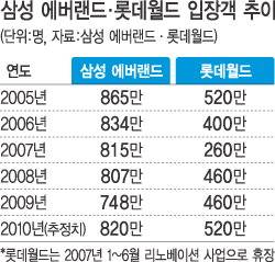 해외 관광객 유치를 통한 탈출구 모색도 여의치 않다. 삼성에버랜드 관계자는 "화교권과 동남아를 중심으로 한 관광객 중 테마파크 이용객은 연간 40만~50만명 수준에 정체돼 있다"면서 "이들도 대부분 관광 위주여서 큰 수익을 기대하기 힘들다"고 말했다.