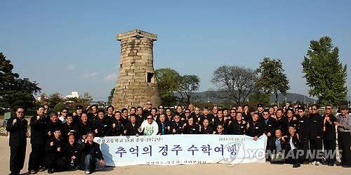 (경주=연합뉴스) 이승형 기자 = 중ㆍ장년이 된 신사와 주부들이 과거 학창시절 추억을 떠올리며 교복을 입고 경북 경주로 떠나는 추억의 수학여행이 인기다.