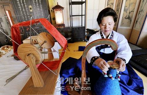 ◇서울시무형문화재 13호 매듭장 조교 노미자씨가 끈목틀과 토짝을 이용해 끈목을 만들고 있다. |