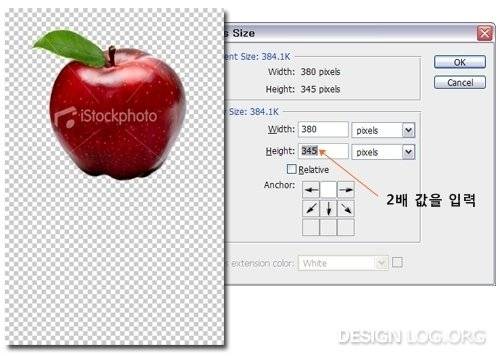 이제는 오브젝트에 반사효과를 적용하기 위해 먼저 캔버스 크기를 2배 정도 늘려야 합니다. 메뉴에서 Image > Canvas Size (Alt+Ctrl+C) 클릭한 다음 위의 이미지처럼 확장방향(Anchor)을 설정하고 2배의 값을 입력하고 확인을 누릅니다. 그럼 좌측처럼 캔버스 크기가 아래로 2배 늘어난 것을 볼 수 있을 겁니다.