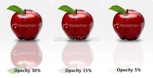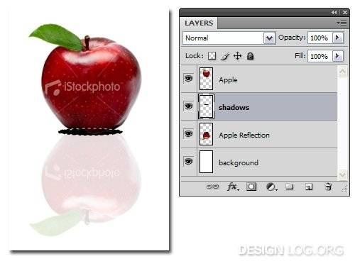새 투명 레이어를 만들고 'shadows'라 적은 다음 'Apple' 레이어 아래에 배치합니다. 툴 박스에서 원형 선택 툴(Eliptical Marquee Tool)로 그림자가 될 크기만큼 그린 후 검정색을 적용합니다. 다음 그림자의 사실적인 표현을 위해 Fiter > Blur > Gaussian Blur 를 클릭하고 7.0 정도의 값을 적용합니다. 그림자 레이어의 블렌딩 옵션을 Multiply mode로 변경하고 70%의 투명도를 적용합니다.