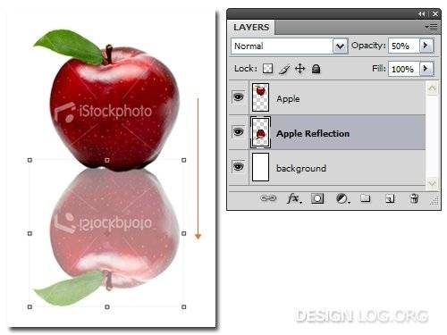 반사효과를 주기위해 배경으로 쓰일 백색 레이어를 만들고 레이어 맨 하단으로 배치합니다. 그 다음은 앞서 원본을 복제한 레이어를 원본 아래로 배치하고 메뉴에서 Edit > Transform > Flip Vertical 을 클릭 아래 방향으로 미러(Mirror) 효과를 줍니다. 이어 효과가 적용된 레이어의 오브젝트 클릭하고 화살표처럼 거울반사의 느낌이 들도록 내려줍니다. 레이어의 투명도는 15%로 설정합니다.