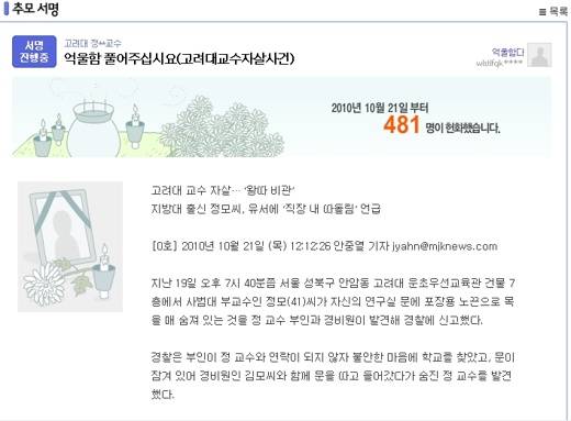 지난 21일 자신을 정교수의 지인이라고 밝힌 이 네티즌은 '억울함다'라는 필명으로 서명운동을 시작했다. 그는 "이번 자살 원인이 단순 우울증, 가정불화, 재임용에 대한 실력부족으로 인한 불안감이라는 쪽으로 언론을 장악하고 있는 힘은 누구인지 모르지만, 옳지 않은 부류"라고 했다.