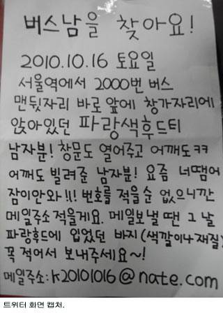 그녀는 버스남을 찾기 위해 화제의 전단지를 약 40장을 복사해 친구와 함께 일일이 걸어다니며 붙였다고 밝혔다. 붙이고 다니는 것도 떨려서 마스크로 얼굴을 최대한 가리고 붙이고 다녔다는 재미있는 에피소드도 전했다. 자신이 내릴때 안 내렸다는 점에 착안해 자신이 내렸던 정류장 다음부터 붙이기 시작했다. 직접 인터넷에 올린 적은 없다. 누군가 보고 사진을 찍어 트위터에 올려 이렇게 화제가 된 것이다.