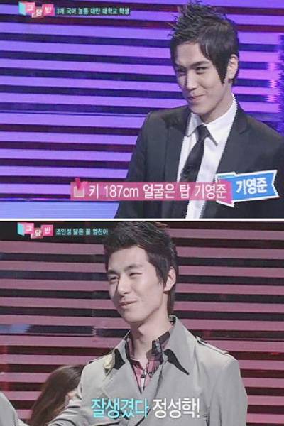 이에 등장한 매력남은 진한 눈매와 여심을 삼킬 것 같은 강렬한 눈빛, 가느다란 입술이 빅뱅 탑을 빼다 박은 출연자 기영준. 해외 유학파답게 유창한 영어를 구사하며 신나는 랩과 함께 등장한 기영준은 김원희와 스페셜 MC 조혜련까지 댄스 삼매경에 빠져들게 하며 출연자들의 마음을 단박에 사로잡는다.