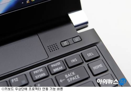 또 키보드 우상단에 보면 프로젝터와 간편하게 연결할 수 있는 버튼이 있다. 이 버튼으로 프로젝트에 연결된 외부 스크린에만 화면을 표시할지, PC 스크린과 외부 스크린 모두 표시할지 쉽게 선택할 수 있다.